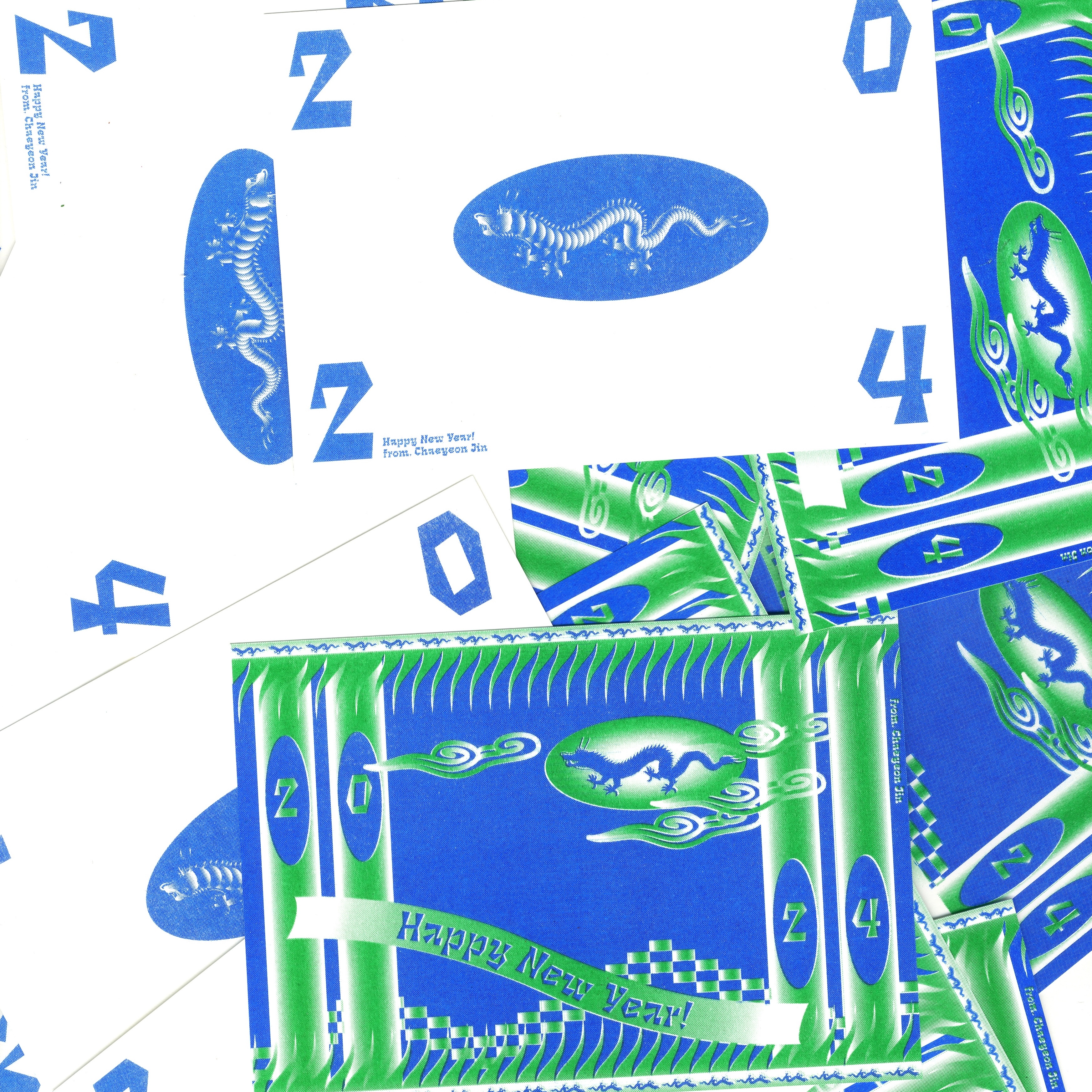 To celebrate the Year of the Blue Dragon in 2024, I designed and distributed New Year greeting cards. The cards were produced using a risography machine with blue and green color separations.